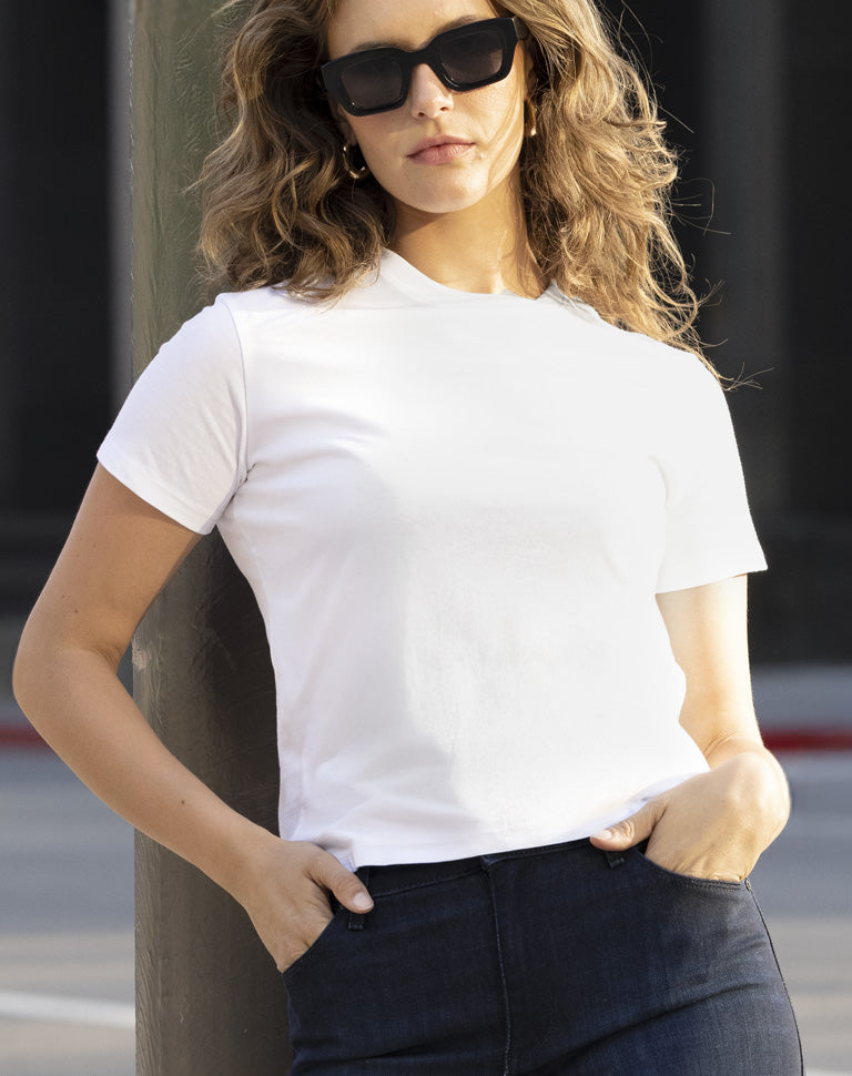 - Meet your favorite everyday tee, the one you can just throw on without a second thought and always feel great in. Its slightly more relaxed yet feminine silhouette drapes just right, landing at that modern, semi-cropped length that pairs beautifully with skirts, shorts, leggings and jeans alike, without revealing your torso.