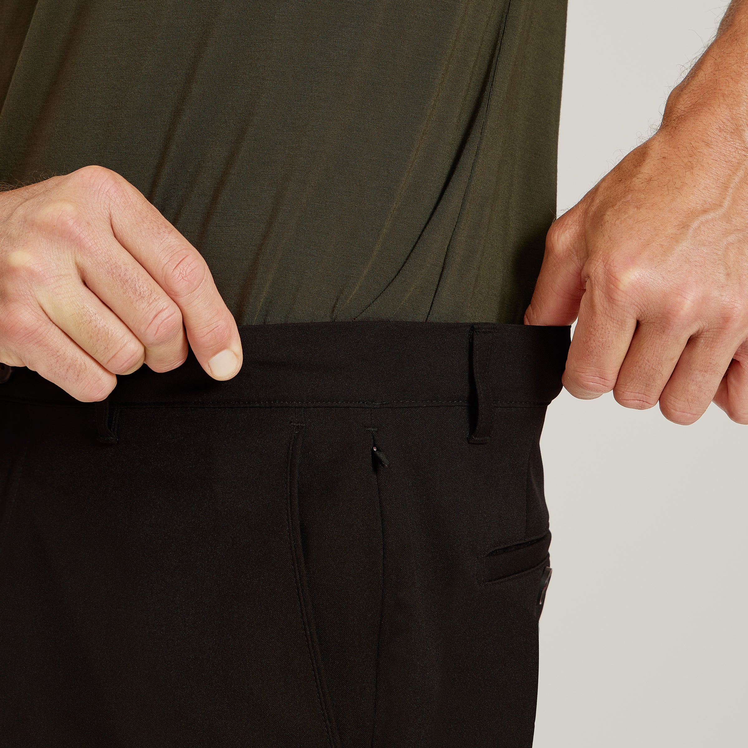 - Their slim fit with a hidden elastic waistband gives you up to 1" of extra room, so you’re always comfortable—ideal for traveling, if you’re in between sizes, or after a little weight gain. It’s completely hidden, so you’ll experience the extra comfort while keeping your look sophisticated.