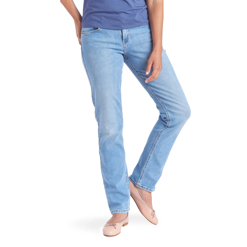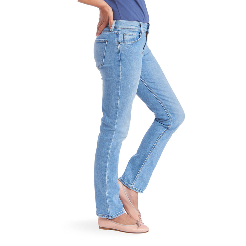 - A straight-legged style that’s straighter through the waist and hips, and slimmer through the legs with a lower mid-rise (front rise of 8.75").
