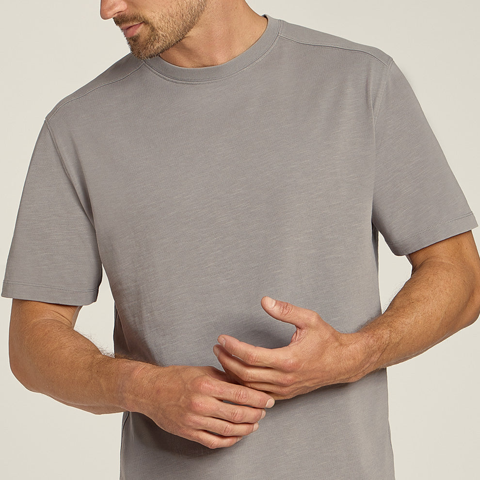 • This oversized tee features dropped shoulders and longer, roomier short sleeves, a crew neck with a 1x1 rib trim, forward shoulder seams, and a clean-finished back neck binding for a premium feel.