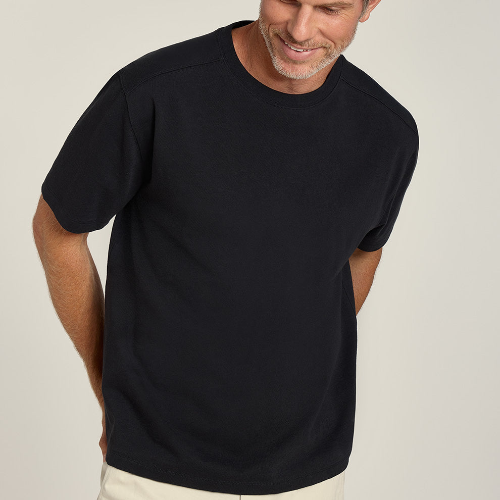 - This oversized tee features dropped shoulders and longer, roomier short sleeves, a crew neck with a 1x1 rib trim, forward shoulder seams, and a clean-finished back neck binding for a premium feel.