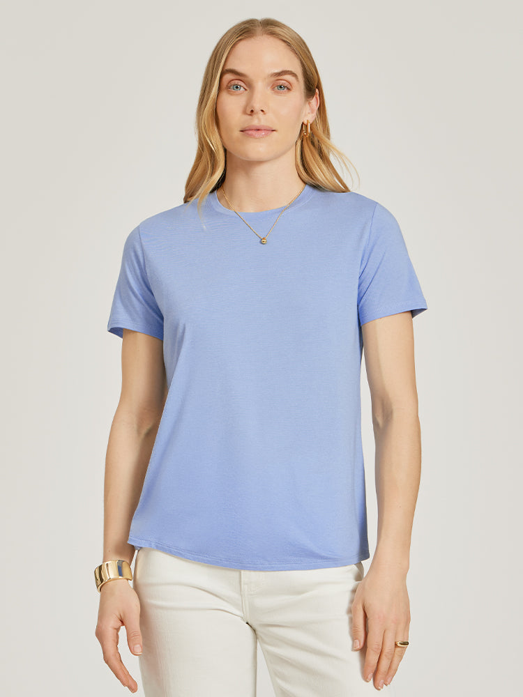- A short-sleeved, relaxed-fit crew neck tee with a curved hem.