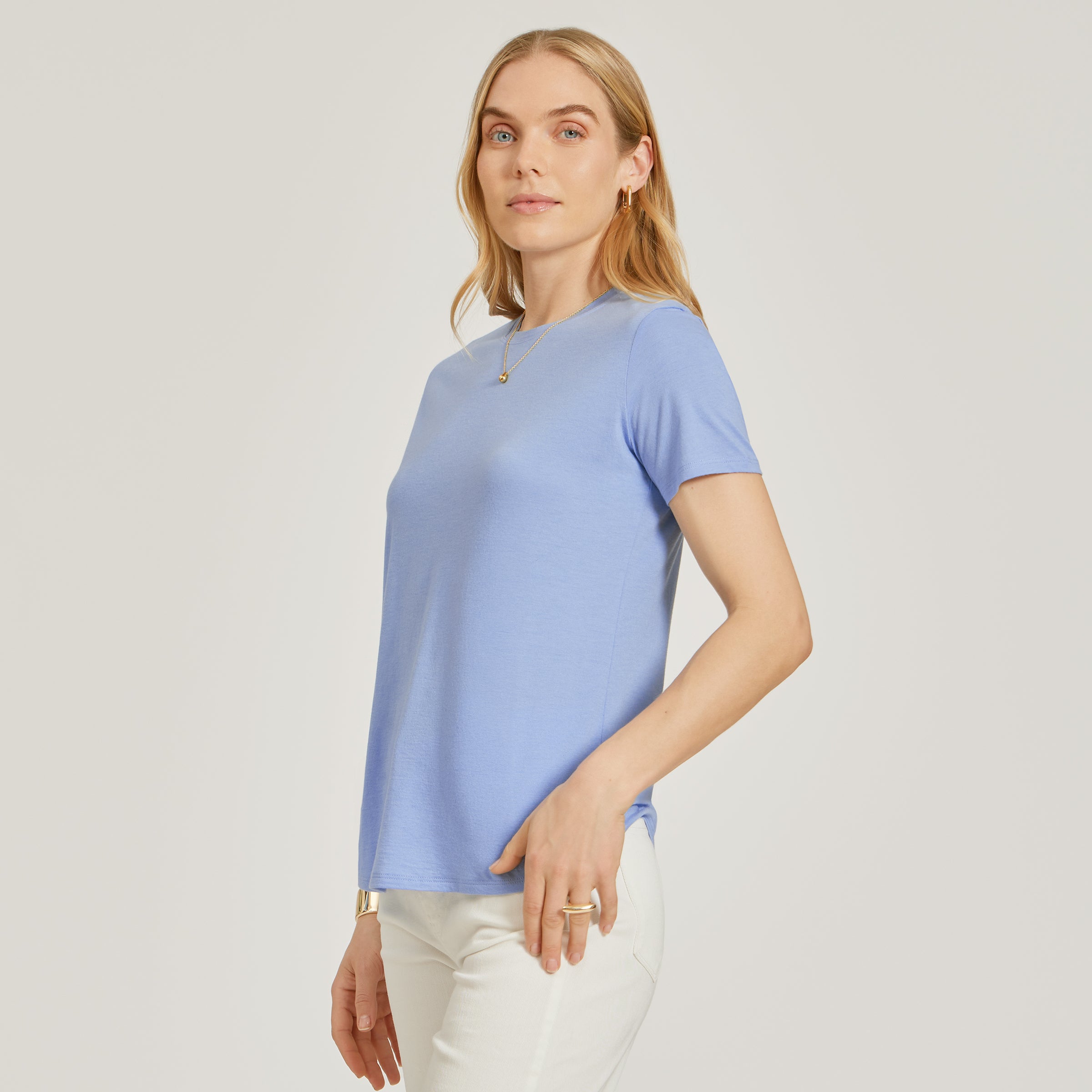- The bestselling Marcy crew neck tee you can’t get enough of, now in a relaxed fit with a longer body, slightly extended sleeves, and a perfectly curved hem that adds subtle length in the front and back. The result? A laid-back and ultra comfortable tee, cut from one of our dressiest fabrics. Perfect for casual and more sophisticated settings alike, it can be worn on its own or easily layered.