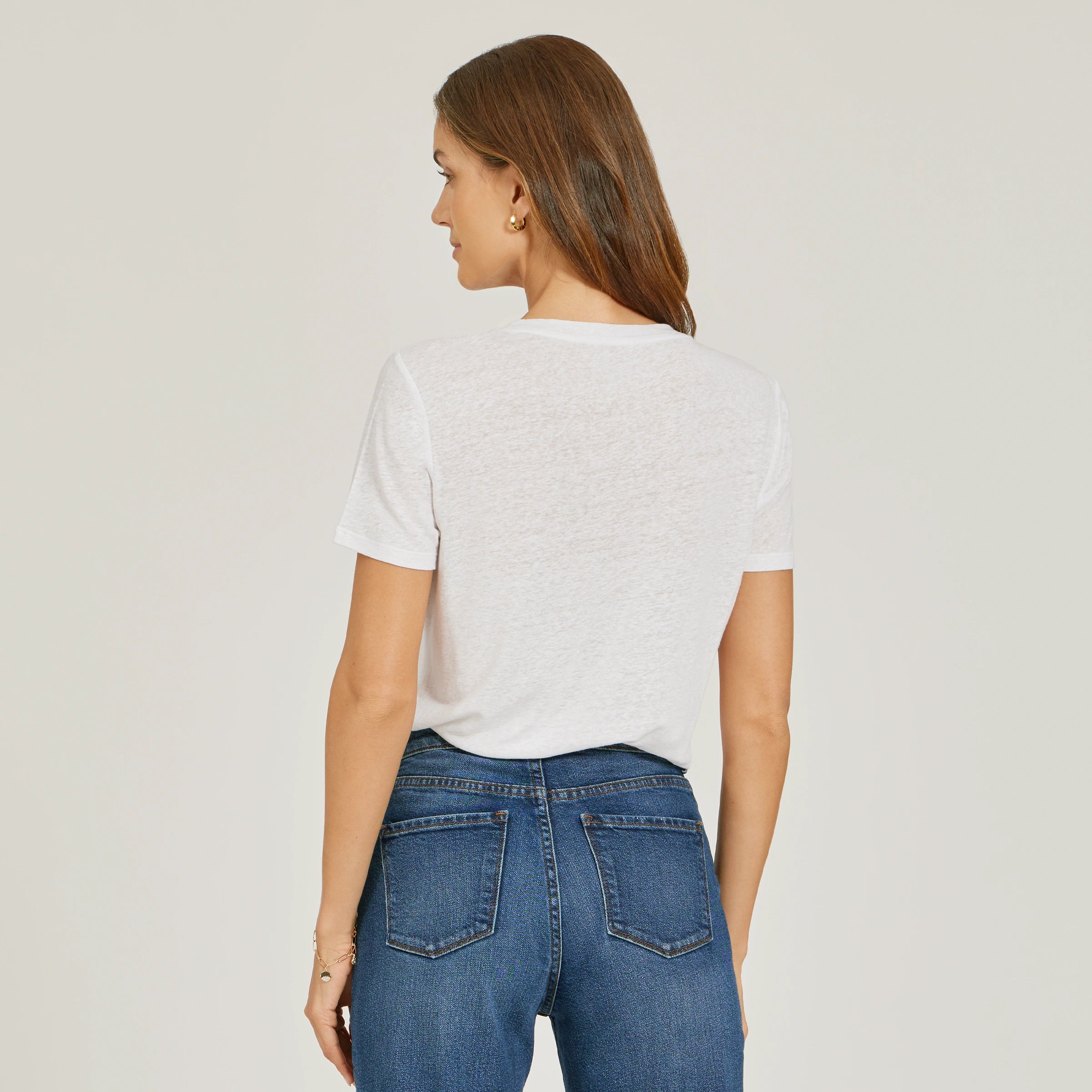 Women wearing White Relaxed Linen Blend V-Neck Tee