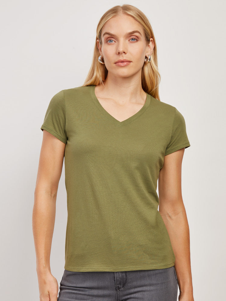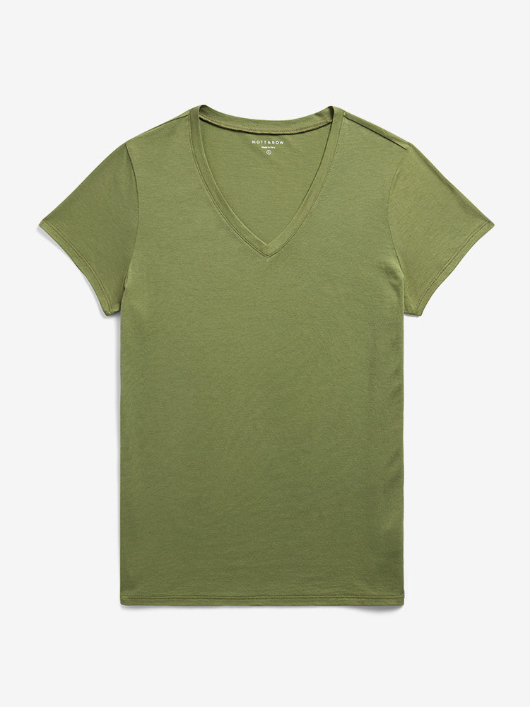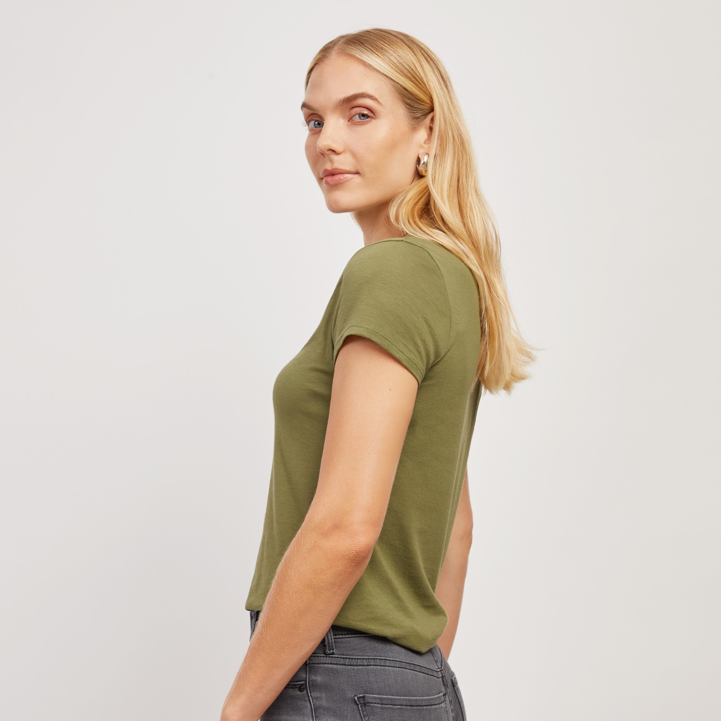 - A short-sleeve, fitted V-neck tee with an elongated body that reached the hips and looks great both tucked in or left out.