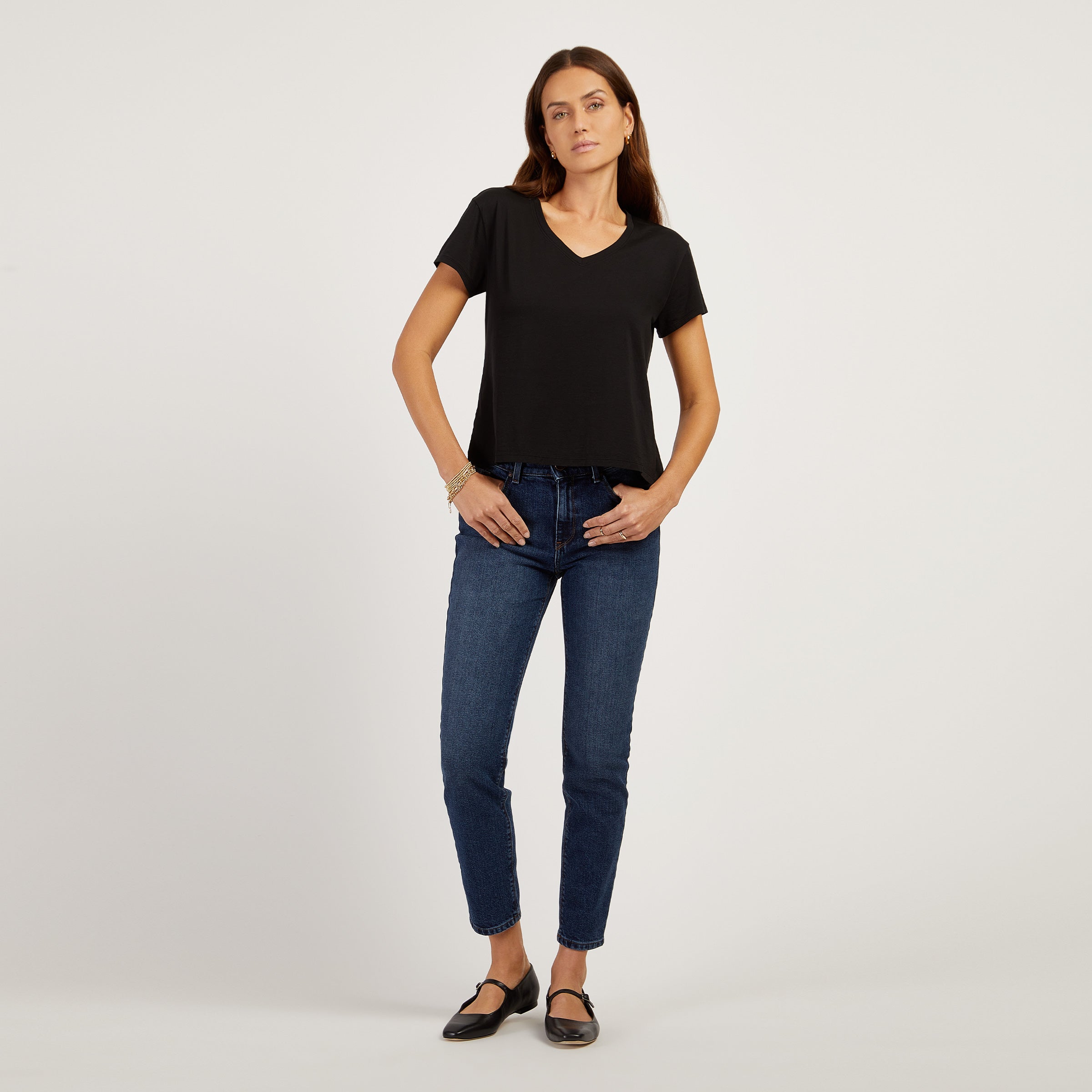 - Camiseta de manga corta con escote en V, corte relajado y largo recortado que llega justo en la parte superior de unos jeans de tiro medio.