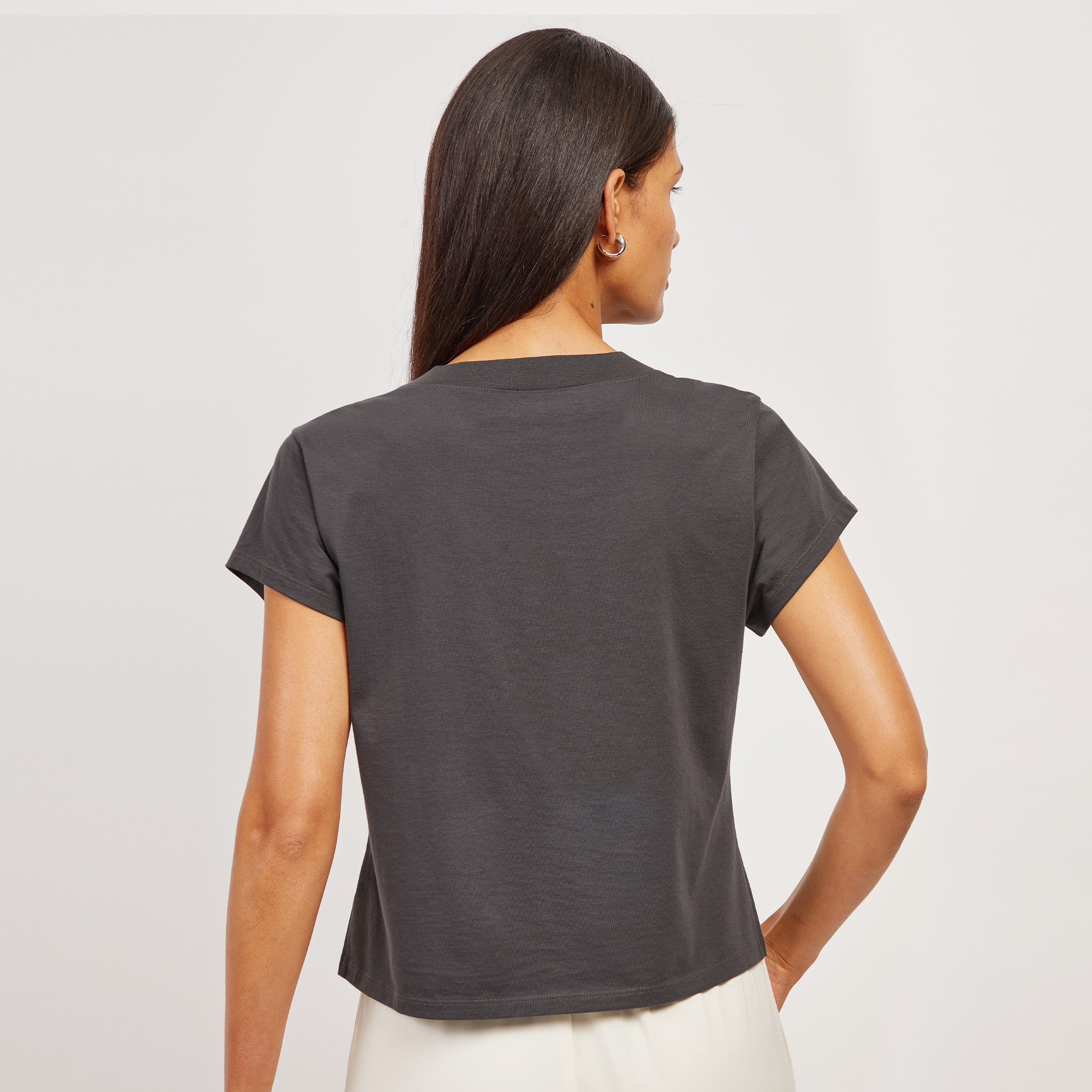 - Camiseta de manga corta con un corte relajado, un largo recortado que llega justo en la parte superior de los jeans de tiro medio y un escote en V pronunciado.