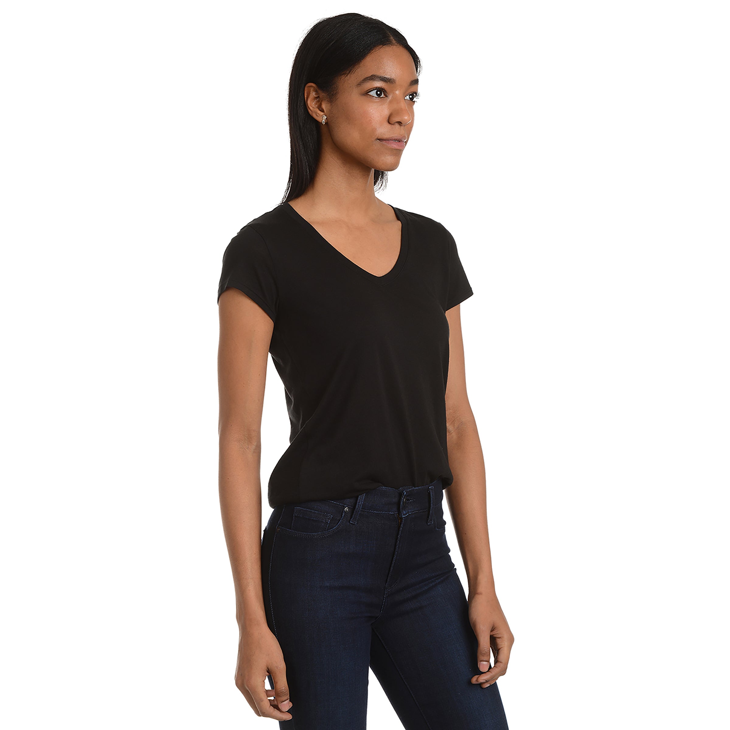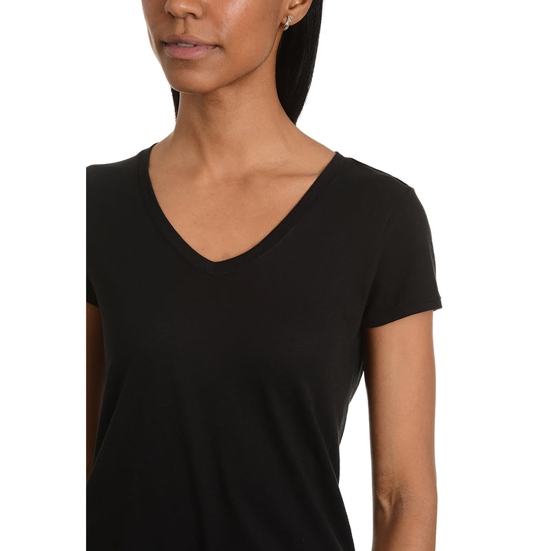 - Una camiseta ajustada de cuello en V y manga corta con un cuerpo alargado que llega hasta las caderas y luce genial tanto metida por dentro como por fuera.