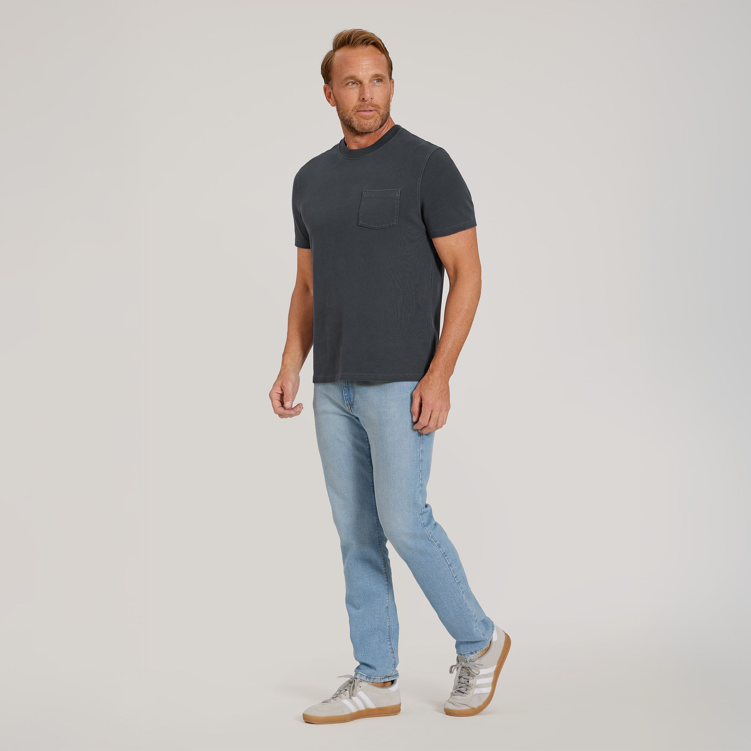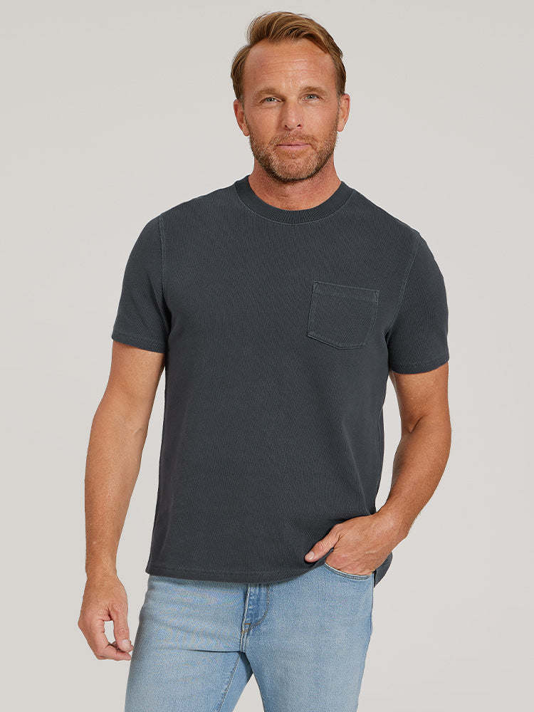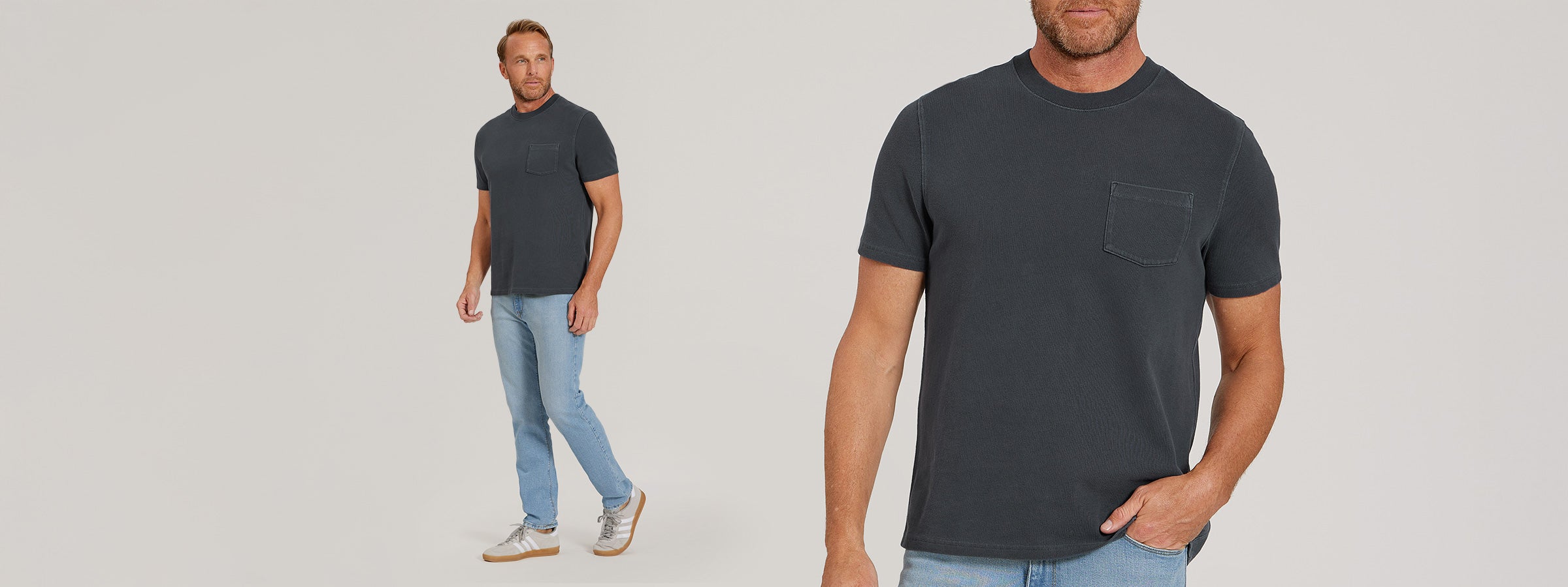 - Camiseta de manga corta con un ajuste relajado pero no extragrande, un largo ligeramente más largo, un bolsillo en el pecho izquierdo y un borde de cuello más ancho de 1" en canalé 1x1, con costuras refinadas y un cuello trasero con acabado limpio con ribete.