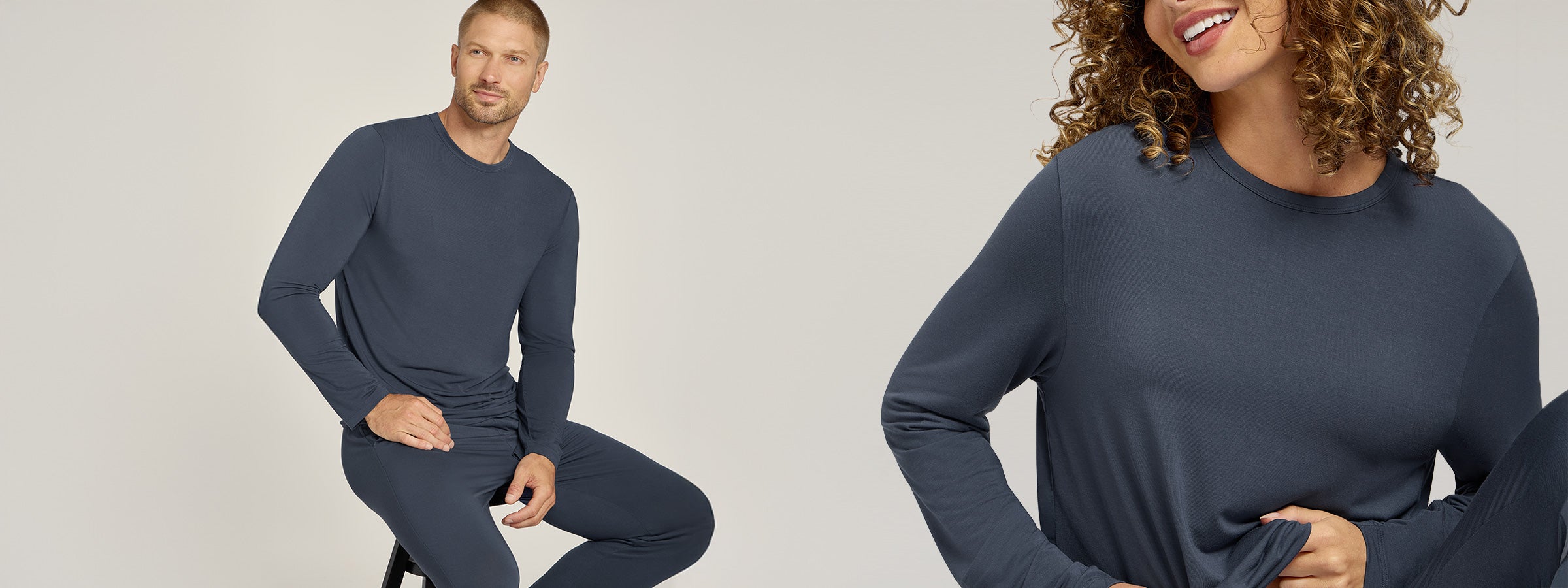 Both models wear a Medium - he’s 6’1”, she’s 5’10”