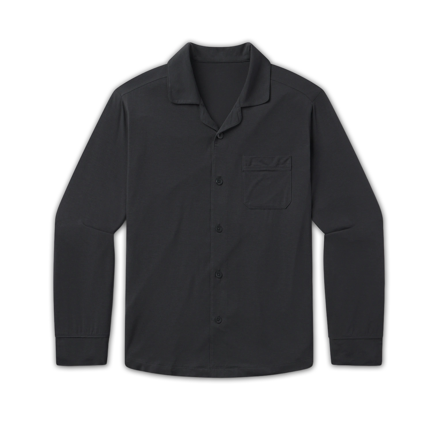 - A relaxed, long sleeved pajama shirt with a five button front closure, a spread collar, one chest pocket and same fabric sleeve cuffs.