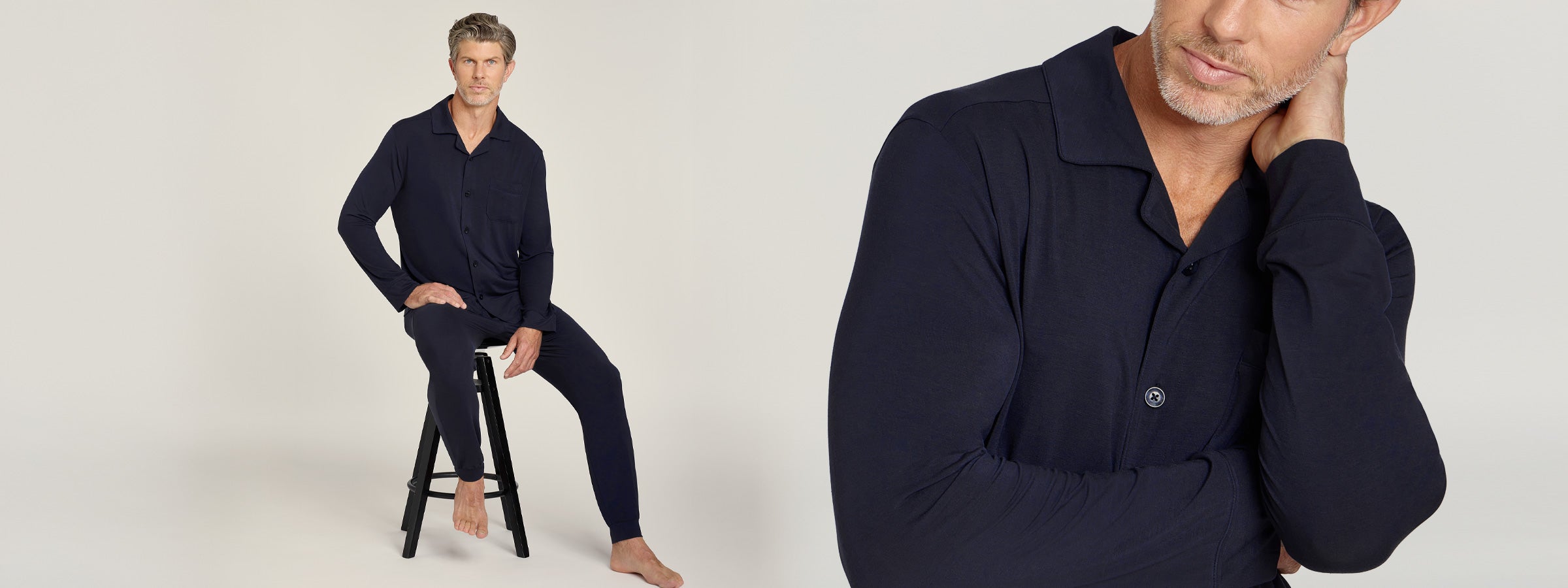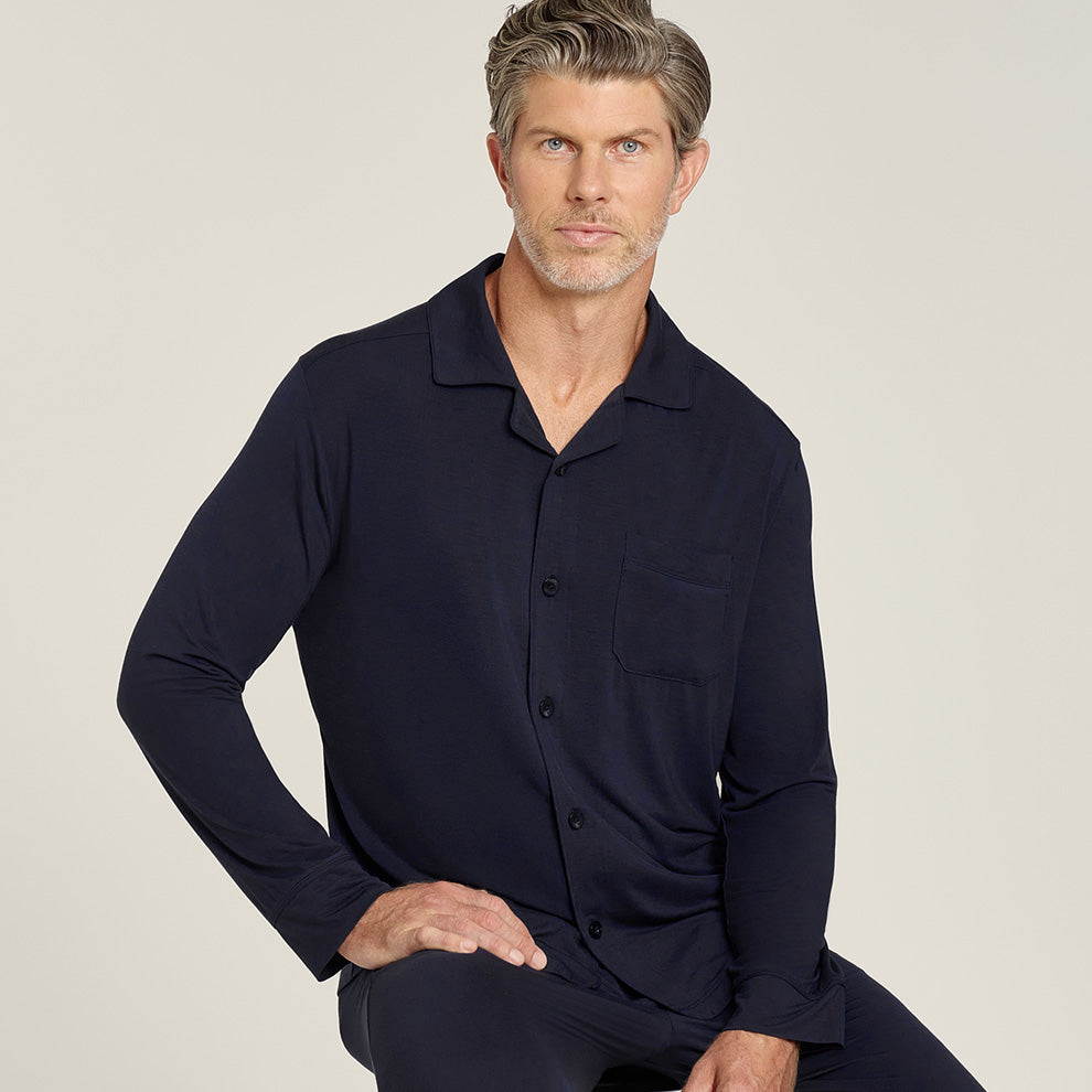 - A relaxed, long sleeved pajama shirt with a five button front closure, a spread collar, one chest pocket and same fabric sleeve cuffs.