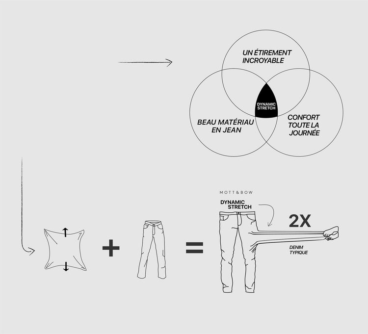 "LE NOUVEAU DENIM STRETCH DYNAMIQUE DE MOTT & BOW OFFRE UN FACTEUR D'EXTENSION DE 35 %, PROMETTANT LE CONFORT DE VOTRE PANTALON DE DÉTENTE PRÉFÉRÉ AVEC LA CONSTRUCTION DE QUALITÉ ET LE STYLE D'UN DENIM HAUT DE GAMME."