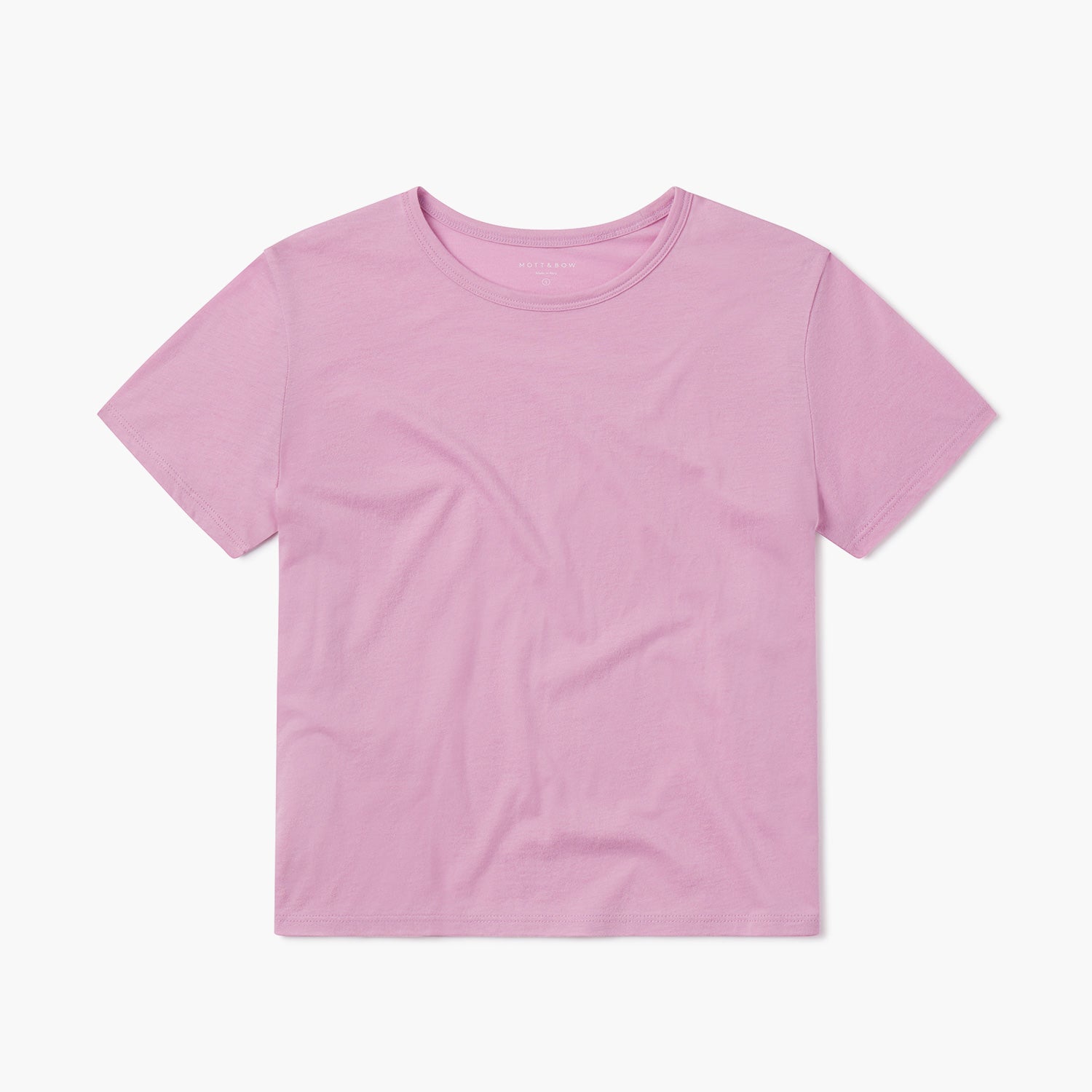 - Short-sleeved, fitted tee with a binded neckline that sits closer to the neck and a slightly cropped length that hits at the top of mid-rise jeans.