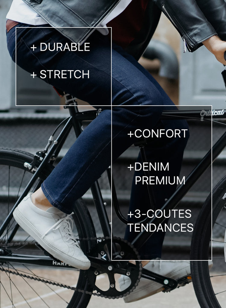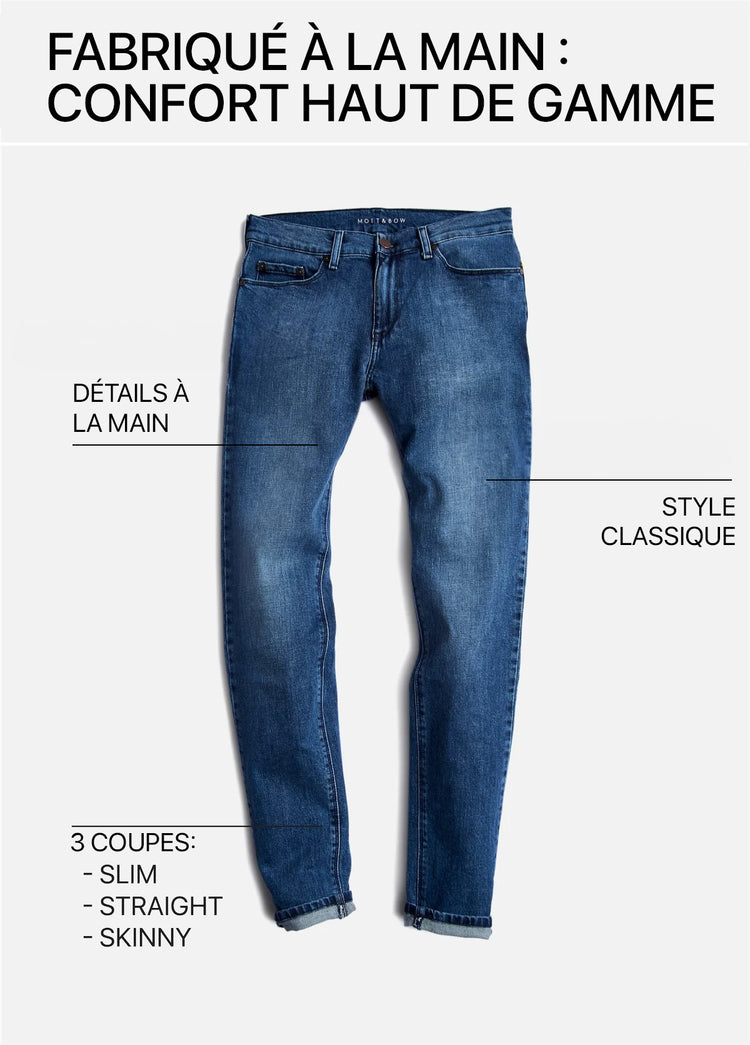 - Une coupe slim classique qui n'est ni trop serrée ni trop ample. Slim sur les hanches et les jambes. C'est notre coupe la plus populaire