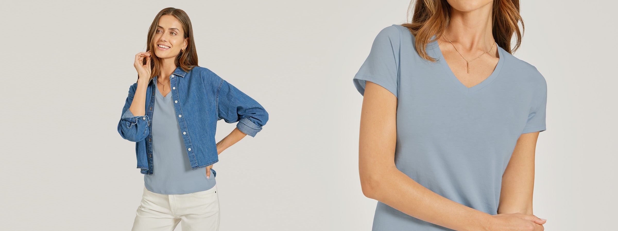 - Dubbed “the holy grail of all V-necks” by the New York Times itself, the Marcy is an all-time bestseller for a reason. Our dressiest tee, it’s lightweight and fitted to skim your curves without clinging too tightly, making it the ideal layering tee, and sophisticated for professional and casual settings alike. It looks great under blazers, cardigans or jackets.