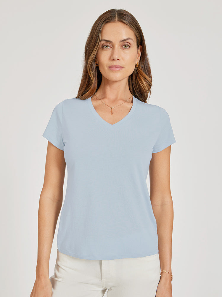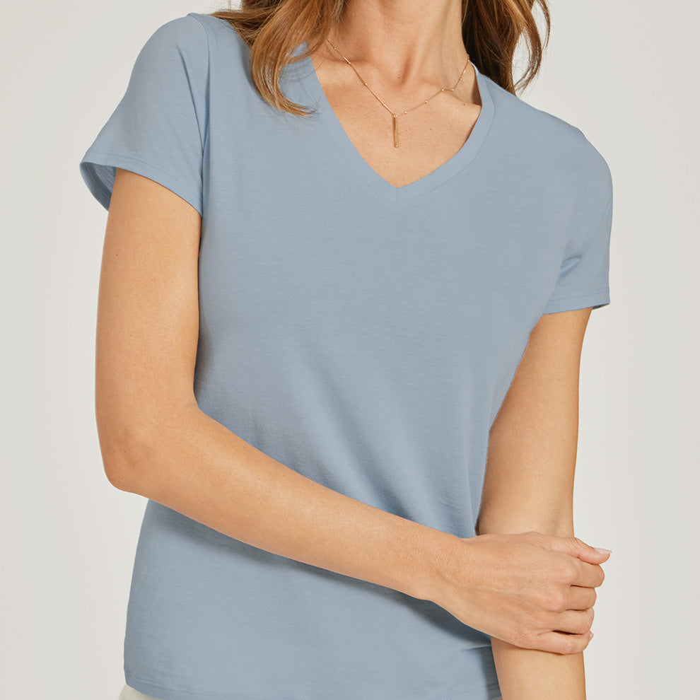 - A short-sleeve, fitted V-neck tee with an elongated body that reached the hips and looks great both tucked in or left out.