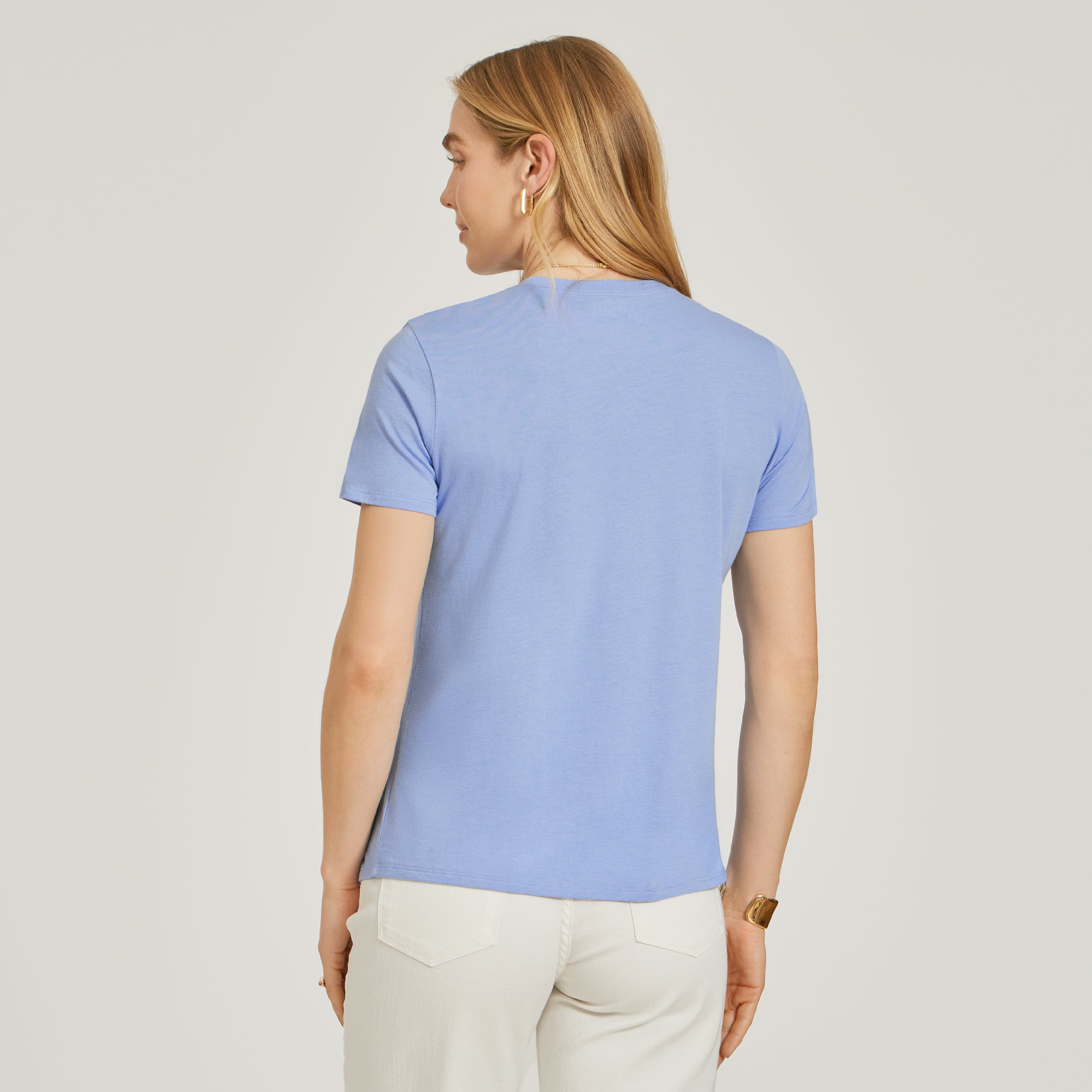 - A short-sleeved V-neck tee with a relaxed fit, longer body length (1” more than the fitted Marcy crew neck), curved hem and slightly extended sleeves.
