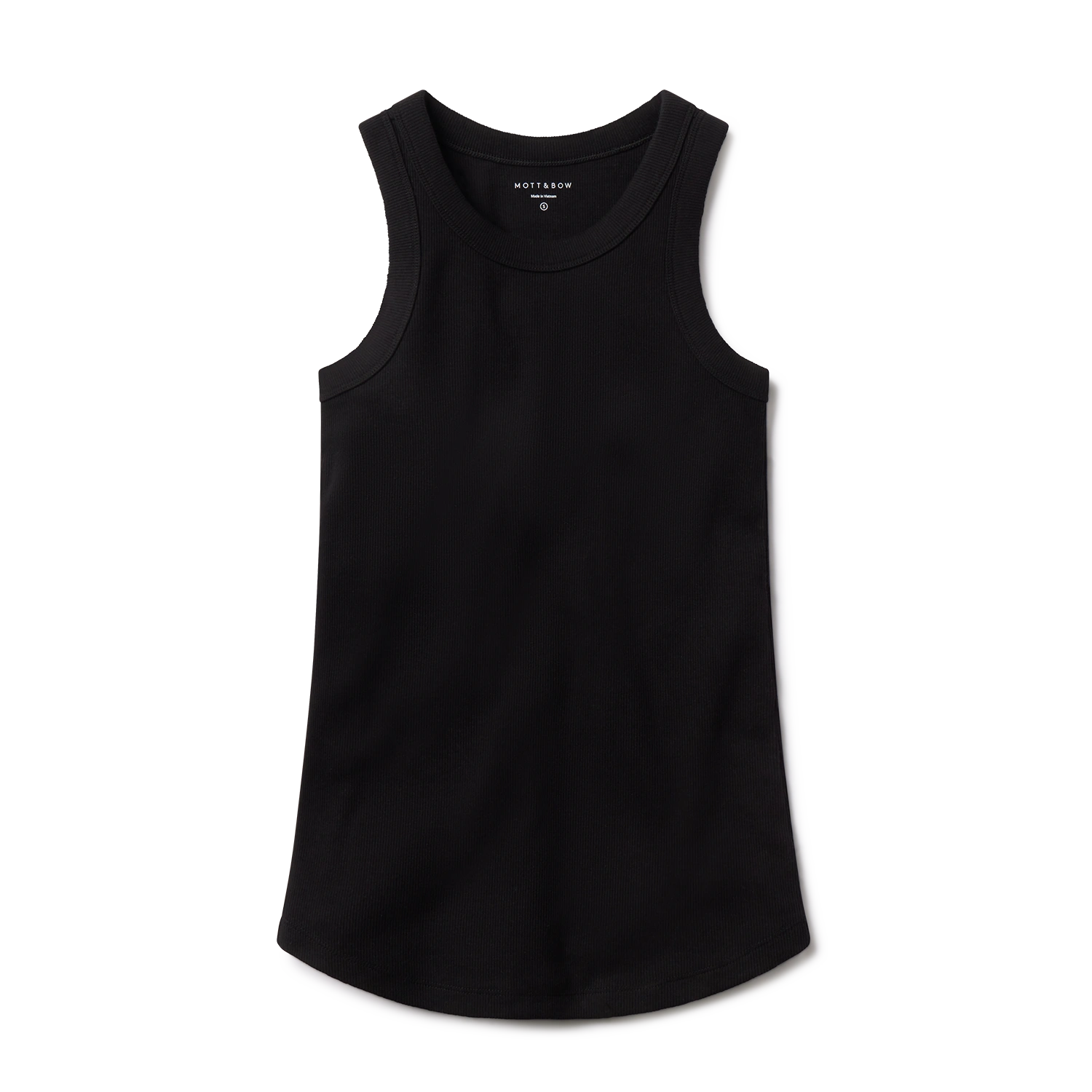 - A fitted, sleeveless top made from 2x2 rib fabric with an open crew neckline, slightly curved armholes, and a curved hem for extra length in both the front and back.
